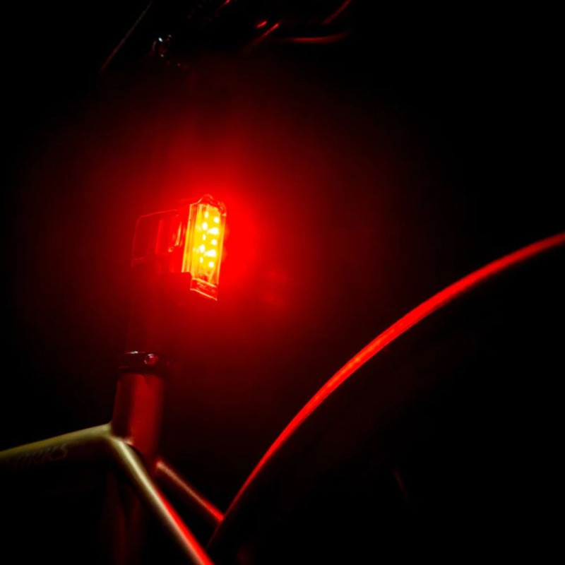 Aan de achterkant biedt de Strip Drive Pro 400 11 verlichtingsstanden, waaronder een daglichtflitsstand van 400 lumen die zelfs bij fel zonlicht goed zichtbaar is. Het gebogen ontwerp past perfect op alle zadelpennen, inclusief aerodynamische modellen.