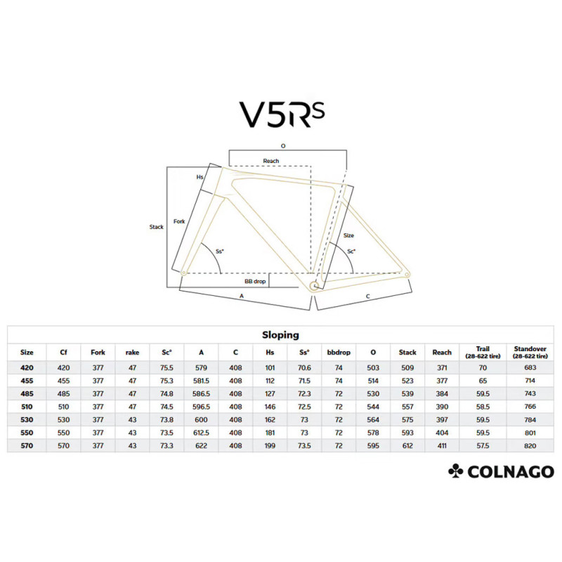 Op basis van de ervaring die is opgedaan tijdens de studies voor de Y1Rs, heeft Colnago het ontwerp van de V5Rs verfijnd met slanke, high-performance profielen. Het frame heeft een kleiner frontaal oppervlak, met een dunnere balhoofdbuis en zadelbuis om de luchtweerstand te verminderen en watts te besparen. De Colnago V5Rs VRWC World Champion doet echter geen concessies aan stijfheid en reactievermogen om te voldoen aan de eisen van profrenners als Tadej Pogacar. Naast een nieuw vorkprofiel heeft deze fiets ook een modernere geometrie voor een agressievere rijpositie. Deze fiets maakt ook gebruik van de BSA bottom bracket standaard, een keuze die is ingegeven door de stijfheid van het frame en die betekent dat de bottom bracket minder oversized en dus lichter is.