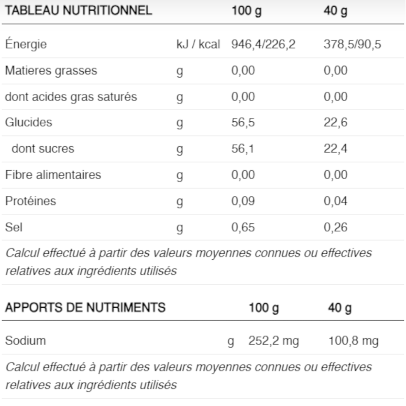 ¤Água, açúcar, frutose, glicose, sumo de morango concentrado, sal, pectina e pectina amilada, aroma, conservantes: ácido ascórbico e sorbato de potássio, corretor de acidez (ácido cítrico).¤