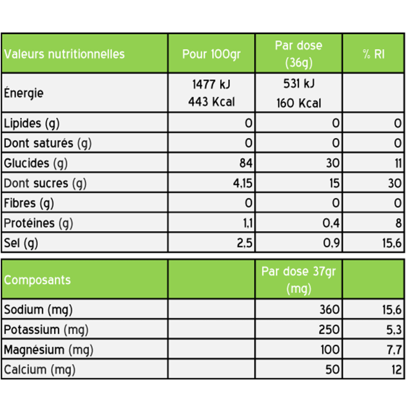 Com 30 g de hidratos de carbono por dose e 360 mg de sódio, ela apoia o seu desempenho, mantendo o seu equilíbrio hídrico. O seu sabor refrescante e agradável a lima e menta torna-o fácil de consumir, mesmo durante esforços intensos.Ideal para competições, longas saídas ou treinos exigentes, esta bebida é vegana, sem glúten, sem OGM e concebida para uma digestibilidade ideal.